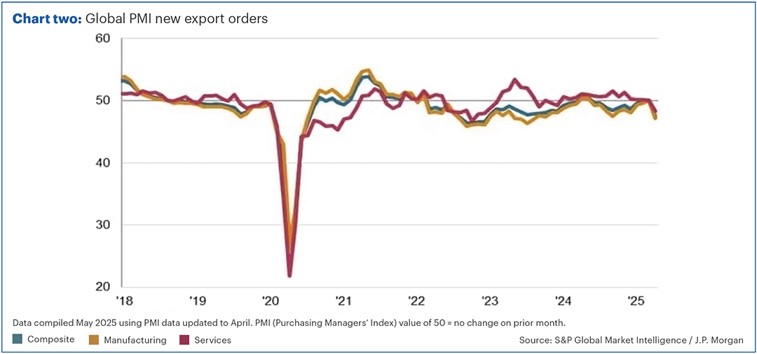 Businesses are also asked about new orders for their products and whether or not orders are increasing or decreasing. Chart two shows the new export orders for companies globally, both manufacturing and services. Both have taken a sharp downturn recently.